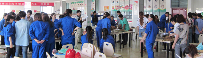 6月19日上午10点,公司员工餐厅五张大桌子上摆满了一盆盆泡好的糯米、粽叶、蜜枣、花生、葡萄干等配料,剪刀、线绳等工具。看着已准备就绪的材料,大家早已洗干净双手等候在旁,按耐不住的热情喷涌而出,想要马上投入到包粽子的活动中去。随着主持人一声令下,包粽子比赛正式开始了。员工餐厅一派热火朝天的忙碌景象,欢声笑语、热闹非凡,配料和工具在员工巧手们的演绎下,剪叶、翻折、填充、封口、扎绳、系紧,所有步骤一气呵成,一个个拳头大小、棱角分明、硬度饱满、出落得俊俏模样的粽子成型了。在包粽子的过程中,能手们边包边演示讲解,“当场授课、现场教学、包教包会”;生手们边包边练习摸索,“一对一模仿、两两交流、三下五除二成型”。在欢乐的氛围中,主持人适时地穿插端午节相关知识问答,员工们积极抢答、踊跃参与,一番自我介绍过后并带来才艺展示,更赢得精美小礼物,使包粽子比赛精彩纷呈、乐趣横生。