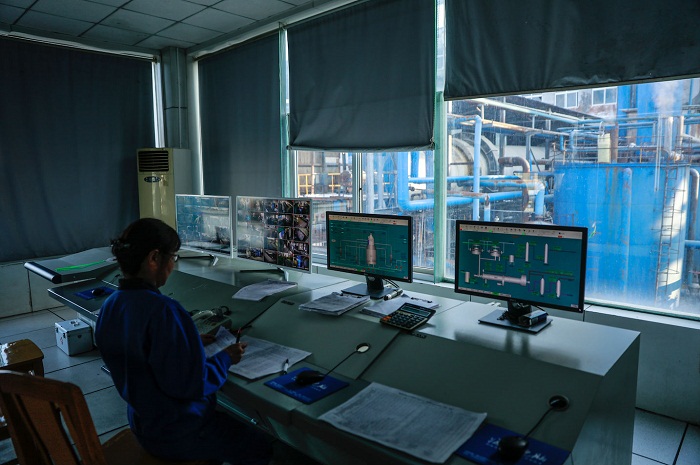 傍晚时分,记者想到车间里看看,夜色中的工厂显得安静而平和,处处闪着黄亮温暖的光。路遇采访中提到的小苏打自动化系统,一位正在工作的大姐操着一口桐柏话告诉我们,“科技进步了,我们的厂子也不能落伍呀,你看,现在粉尘少多了,噪音也小多了。这要是以前,我们相邻的工作人员说话不大声喊都听不到,现在你瞧瞧,我说话你听得清清楚楚。”说着她满脸笑容乐呵呵。