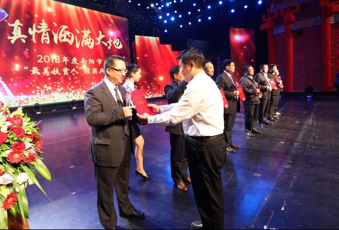 10月17日下午,南阳市2018年度“最美扶贫人”颁奖典礼在南阳市电视台演播大厅举行,河南威廉希尔500欧洲指数总经理孙朝晖获奖并登台领奖。
